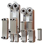 | Паяные пластинчатые теплообменники типа CB, производства фирмы Альфа Лаваль В основе конструкции паяных теплообменников лежит принцип использования меди для пайки пластин из нержавеющей стали (AISI 316), что позволяет отказаться от использования прокладок. Производительность теплообменников может быть от 10 кВт до 5 МВт. Паяные теплообменники Альфа Лаваль работают при температуре до 175°С и давлении до 32 атмосфер, что удовлетворяет наиболее распространенным условиям эксплуатации в системах централизованного теплоснабжения. |